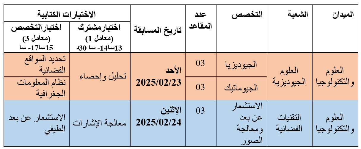تعلن المدرسة الوطنية العليا للعلوم الجيوديزية والتقنيات الفضائية ENSGTS)، أرزيو) عن تنظيم مسابقة الالتحاق بالتكوين في الطور الثالث، للسنة الجامعية 2024-2025، وذلك في الشعب التالية: