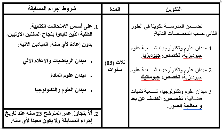 وعليه، تقترح على طلبة المدارس العليا والجامعات و المراكز الجامعية، الحصول على تكوين في الطور الثاني بعد النجاح في المسابقة الوطنية التي تنظمها المدرسة بداية كل سنة جامعية