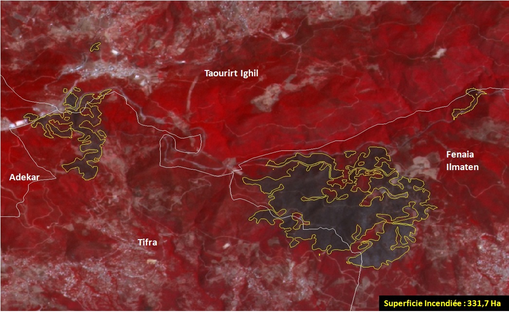 أتاح هذا التحليل تحديد موقع آثار الحريق وتعيين حدودها ، بحيث تغطي مساحة إجمالية مغطاة بالحريق تقدر بـ 1896.6 هكتار.