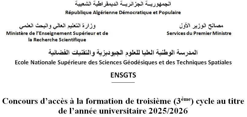 L’École Nationale Supérieure des Sciences Géodésiques et des Techniques Spatiales (ENSGST, Arzew) organise le concours d’accès à la formation de troisième cycle, pour l’année universitaire 2025-2026, dans la filière des Sciences Géodésiques.