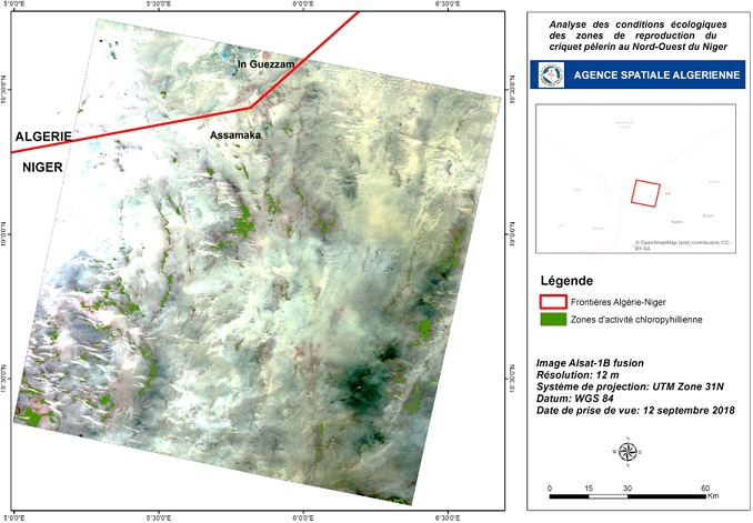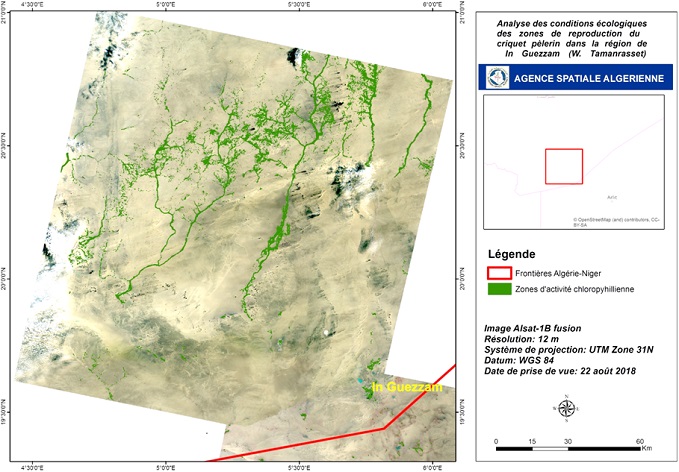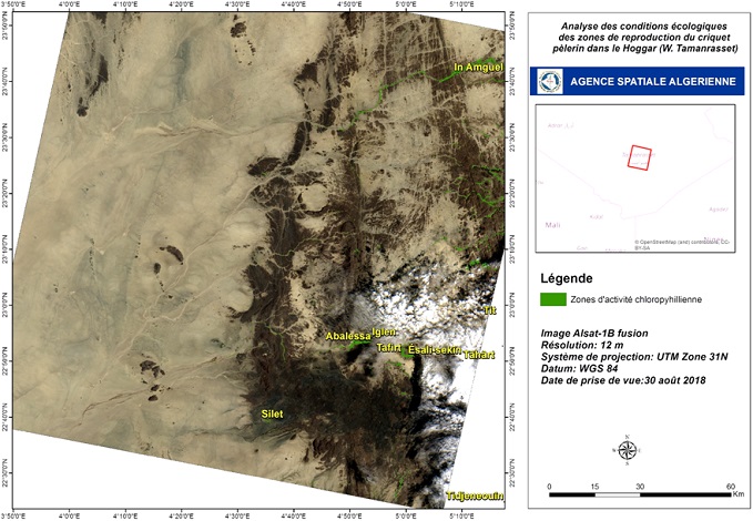 En prévision du démarrage de la campagne automnale 2018 de surveillance et de lutte contre le criquet pèlerin au niveau des régions de l’extrême sud algérien, et suite aux quantités importantes de pluies enregistrées et le risque de multiplication des populations de criquets au niveau de ces zones, l’Agence Spatiale Algérienne, sur demande de l’INPV, a exploité et analysé les images satellitaires Alsat-1B couvrant ces régions pour la période août- septembre 2018, afin d’identifier les zones écologiquement favorables au développement du criquet pèlerin.