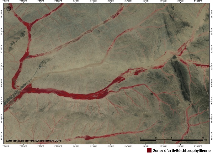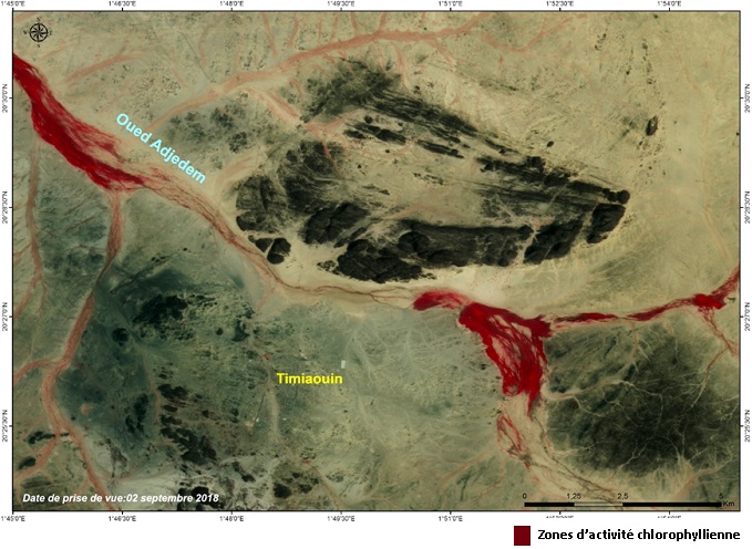 - Région de Tin Zaouatin :Cette région est caractérisée par un réseau hydrographique dense avec un grand nombre d’oueds, la végétation dans cette région présente une très forte activité chlorophyllienne, notamment au niveau de Oued Adjedem (Timiaouin) ;
