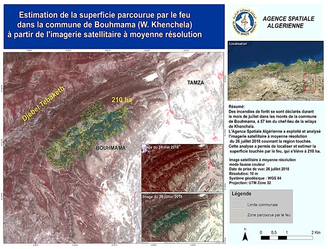 L’analyse issue de l’exploitation d’images satellitaires prise le 26 juillet 2018, a permis de localiser et d’estimer la superficie parcourue par le feu, qui s’élève à 210 ha.