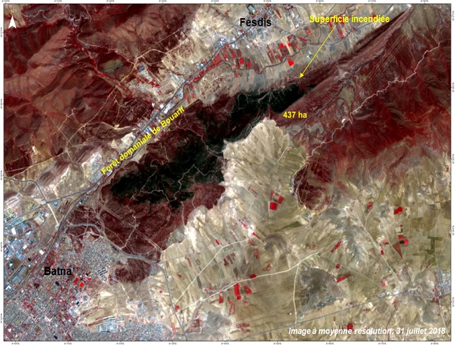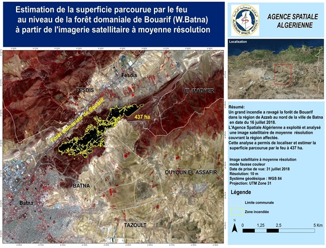Un incendie a touché la forêt de Bouarif dans la région de Azzeb au Nord de la ville de Batna en date du 16 juillet 2018. L’Agence Spatiale Algérienne a exploité et analysé une image satellitaire de moyenne résolution couvrant la région concernée.