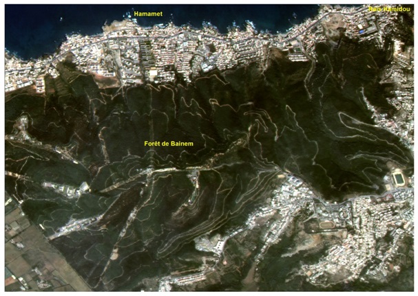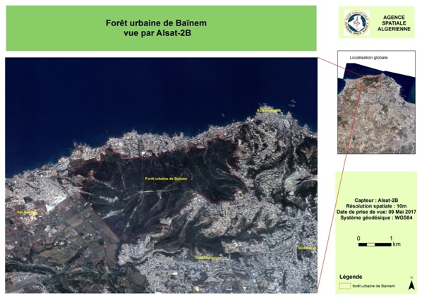 - La délimitation de la forêt de Bainem, utilisant l’image satellitaire Alsat-2B du 09 mai 2017;