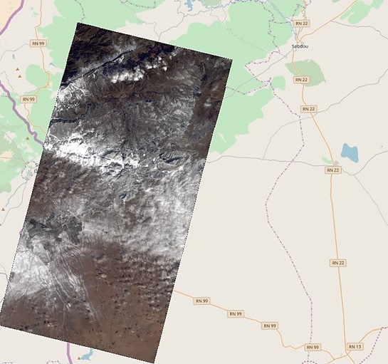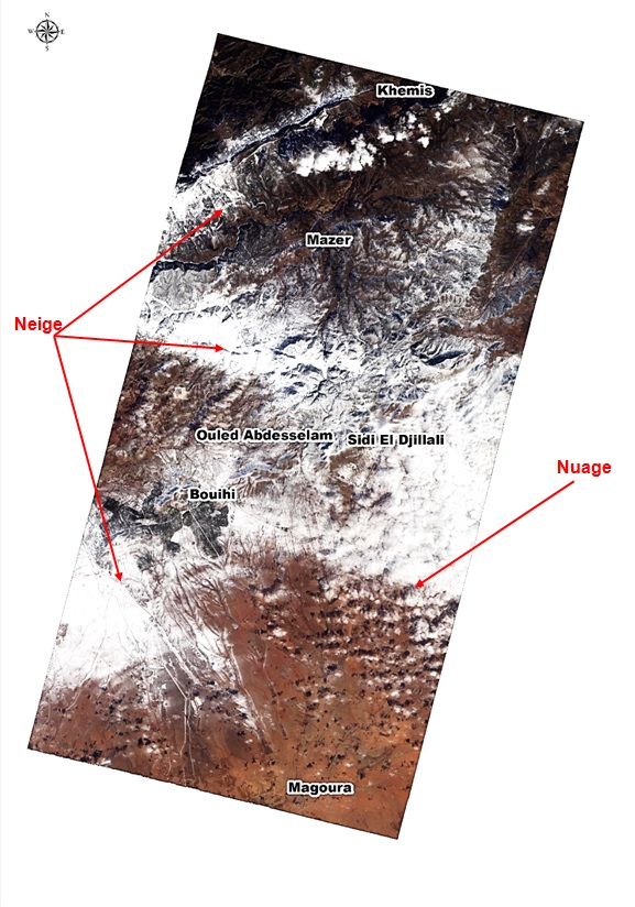 L’image Alsat-2B prise le 07 février 2018 sur la région de Sidi Djillali (sud de la wilaya de Tlemcen) située à 34 km au Sud-Ouest de Sebdou, met en évidence plusieurs zones enneigées. Ces zones enneigées sont situées sur des altitudes dépassant les 1000 m, avec un sommet situé à 1845 m.