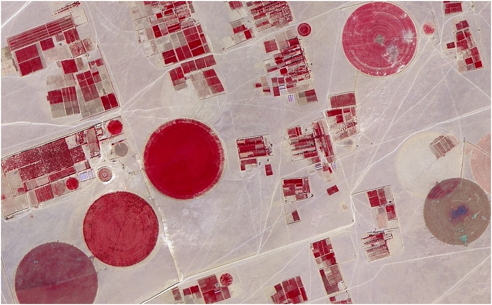 Fig.03 : L’image Alsat-2B montre les différents modes de culture pratiqués dans la wilaya d’Adrar et caractérisés par une céréaliculture sur pivots et des cultures maraichères sous serres.