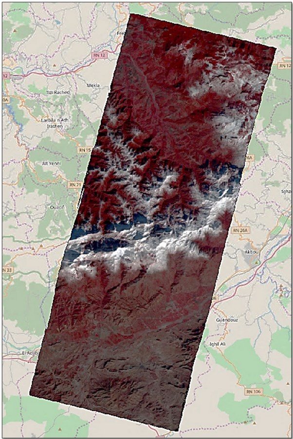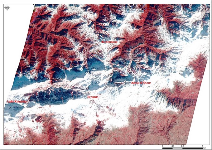 L’image Alsat-2A prise le 06 décembre 2017 sur une région de la kabylie, met en évidence les zones enneigées du Massif de Djurdjura, notamment sur les sommets de Lalla Khedidja, Tirourda et Azrou N’Thour.