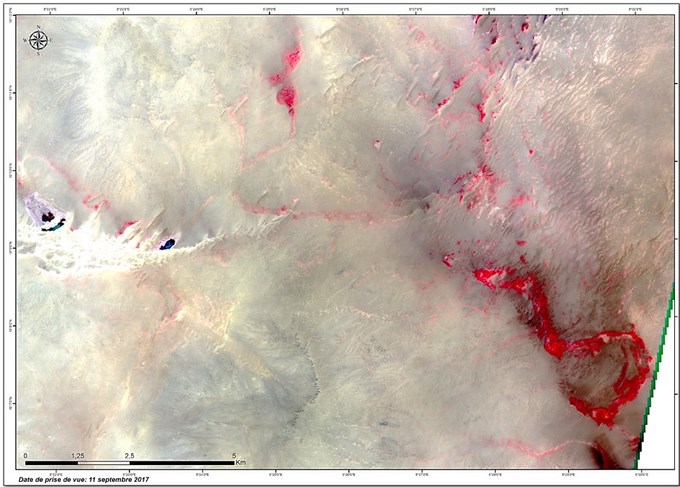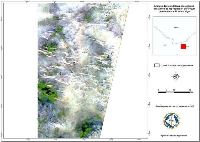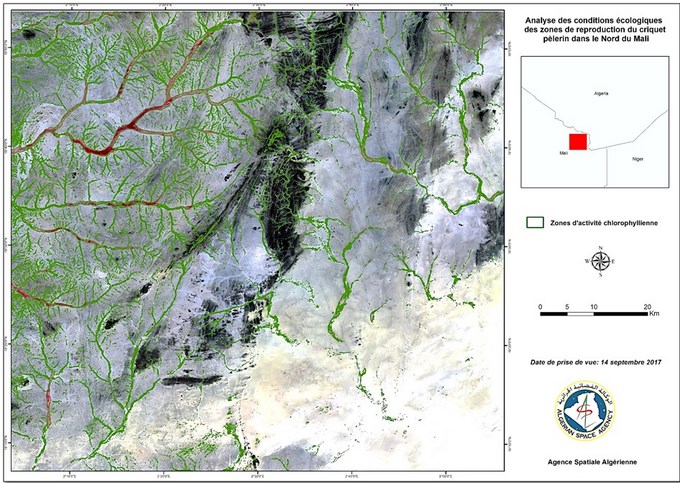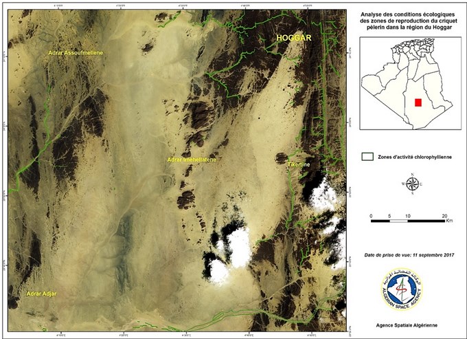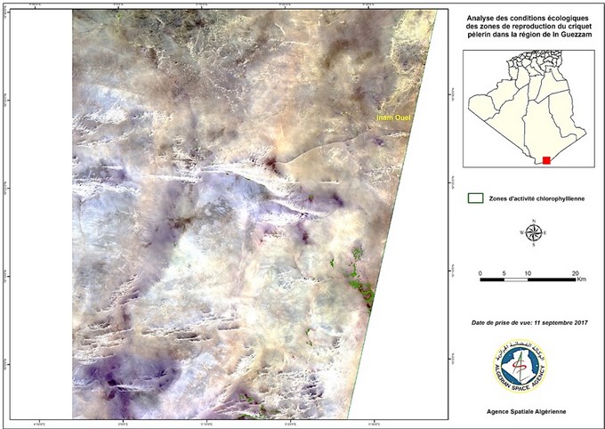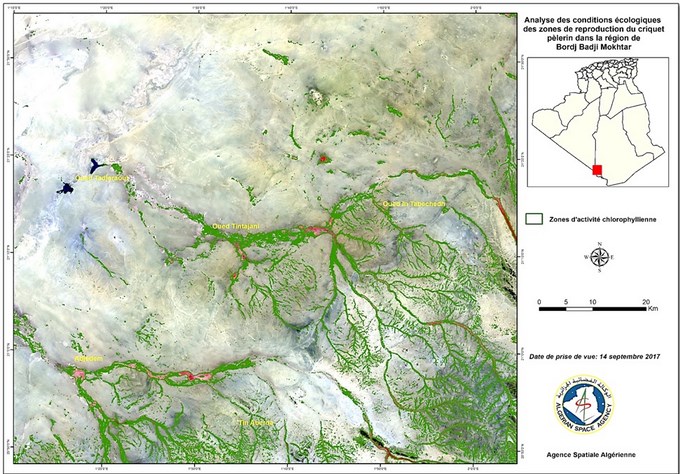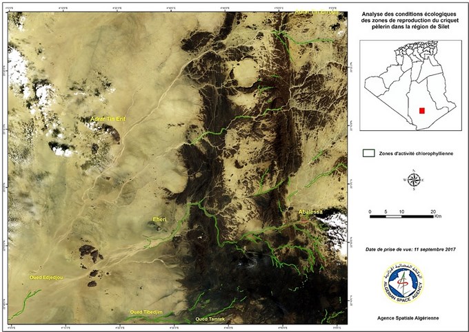 En prévision du démarrage de la campagne automnale 2017 de surveillance et de lutte contre le criquet pèlerin au niveau des régions de l’extrême sud Algérien et suite aux quantités importantes de pluies enregistrées et le risque de multiplication des populations des criquets au niveau de ces zones, l’Agence Spatiale Algérienne, sur demande de l’INPV, a exploité et analysé les images satellitaires à 10 m de résolution du mois de septembre 2017, afin d’identifier les zones écologiquement favorables au développement du criquet pèlerin.