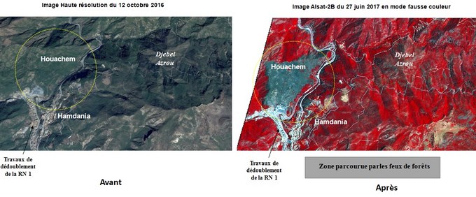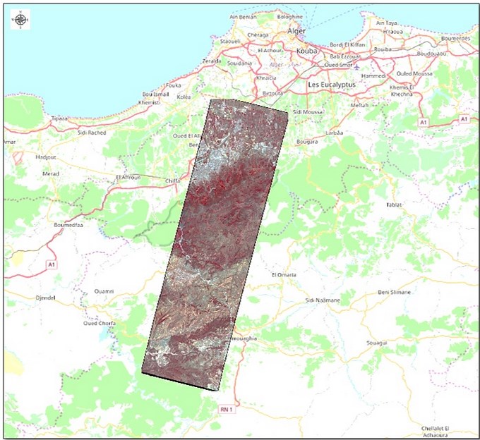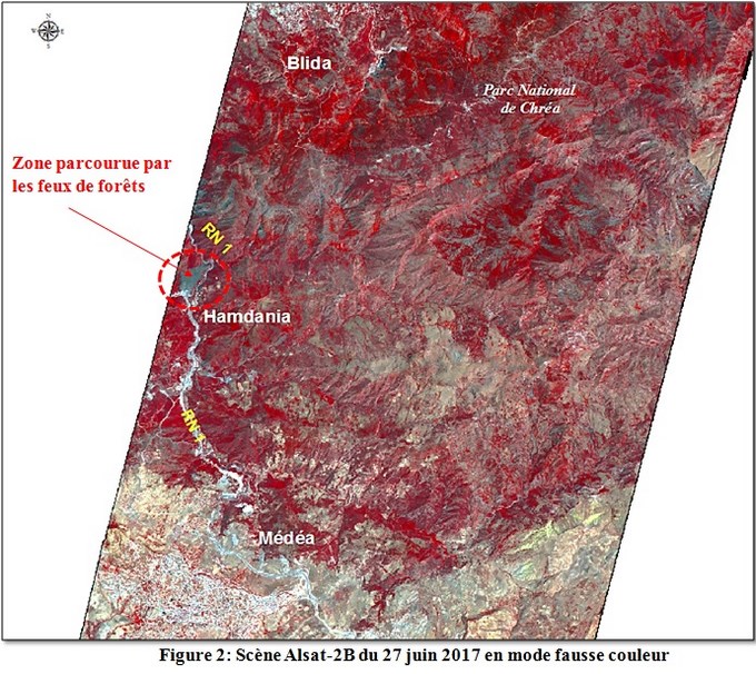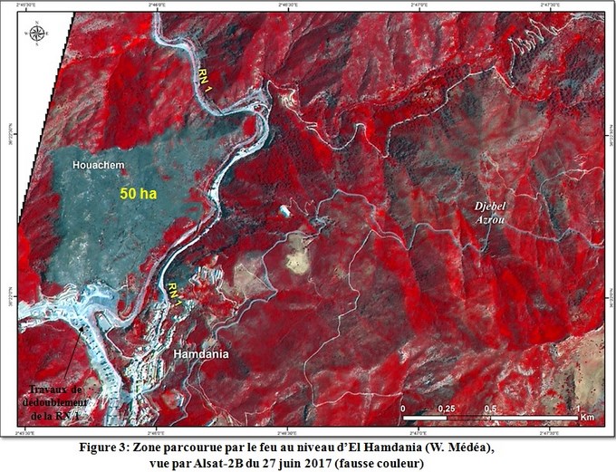 Dans le cadre du suivi des feux de forêts de la campagne estivale 2017, à partir des images satellitaires, l’ASAL a analysé les images Alsat-2B, prises le 27 juin 2017 qui couvrent la forêt d’El Hamdania (W, Médéa), touchée par des incendies Après localisation et délimitation précise de la zone parcourue par le feu, l’estimation de la superficie parcourue par le feu est de 50 ha.
