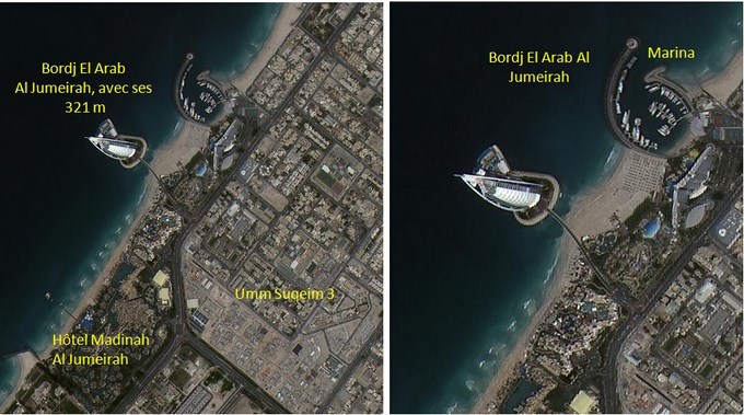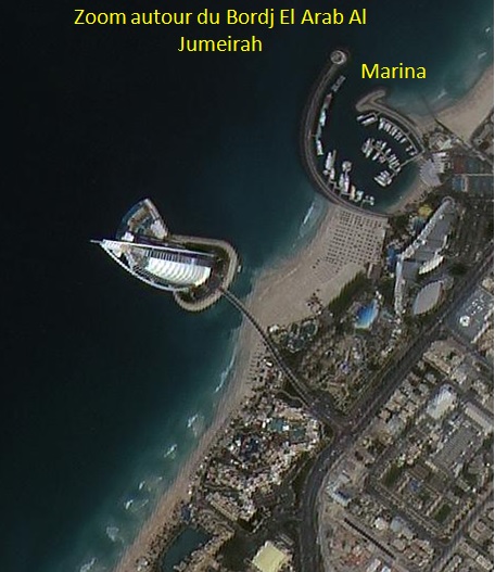 Le satellite Alsat-2B a couvert le 18 avril 2017, l’Emirat de Dubaï ( Emirats Arabes Unis). L’image Alsat-2B a été prise avec un angle latéral de 29.15 degré, permettant ainsi d’obtenir une vue en perspective de la tour de Bordj El Arab Al Jumeirah avec ses 321 m de hauteur. En effet, la forme en voile géante, caractéristique architecturale de la face Sud-Est de la tour, est visible sur cette image.