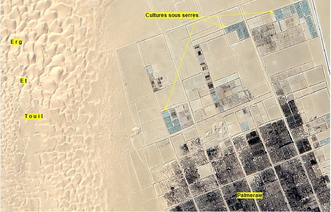 Enfin, à l’Est aux alentours de Hassi Ben Abdellah, la présence de cultures sous pivot, contraste avec le paysage désertique environnant.