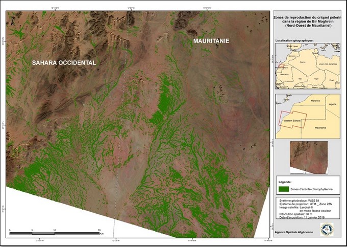 Suite à la résurgence du criquet pèlerin dans l’Ouest de la Mauritanie et au Sahara Occidental où des petits groupes se sont formés à partir des larves et des ailés en décembre 2015, et compte tenu de la situation similaire observée au Nord du Mali et du Niger, l’Agence Spatiale Algérienne a exploité quatre scènes satellitaires à moyenne résolution du mois de janvier 2016, couvrant ces zones sur une superficie de 133 950 Km2. Les zones concernées par cette analyse sont : les régions de Smara, Boucraa et Boujdour (Sahara Occidental), Bir Moghrein (Mauritanie), le Nord du Mali (Région de Kidal), et la région d’Assamakka (Niger) Après analyse, une très forte activité chlorophyllienne a été constatée, dans les régions de Bir Moghrein (Mauritanie), Smara, Boucraa et Saguia El Hamra (Sahara Occidental), où le couvert végétal est abondant et dense, et localisé essentiellement au niveau des lits d’oueds. Dans la partie Ouest du Sahara Occidental, près du littoral, la végétation est présente au niveau des dépressions endoréiques, avec une très forte activité chlorophyllienne. Au Nord du Mali (région de Kidal), la végétation est localisée essentiellement au niveau des lits d’oueds, avec une activité chlorophyllienne moyenne à forte. Au niveau de la région d’Assamakka (Nord du Niger), la végétation est présente au niveau des dépressions endoréiques avec une activité chlorophyllienne très forte. Cette analyse montre que dans les zones identifiées, les conditions écologiques sont très favorables à la reproduction du criquet pèlerin. Ceci confirme les rapports des équipes de terrain faisant état de la présence de groupes de larves et d’ailés en décembre 2015. Cette situation est aussi valable pour janvier 2016.