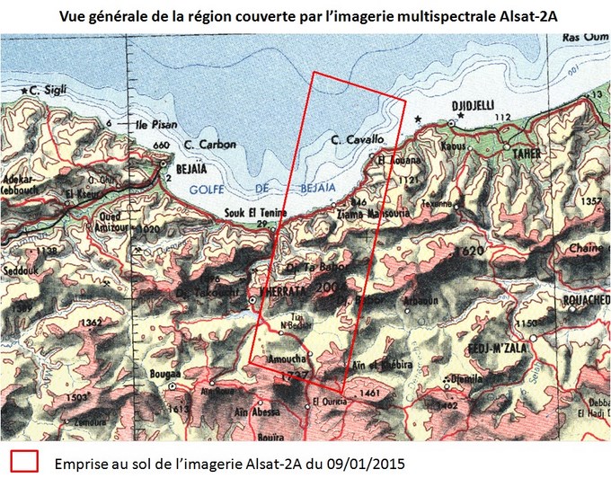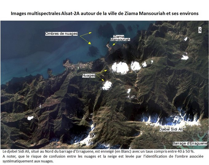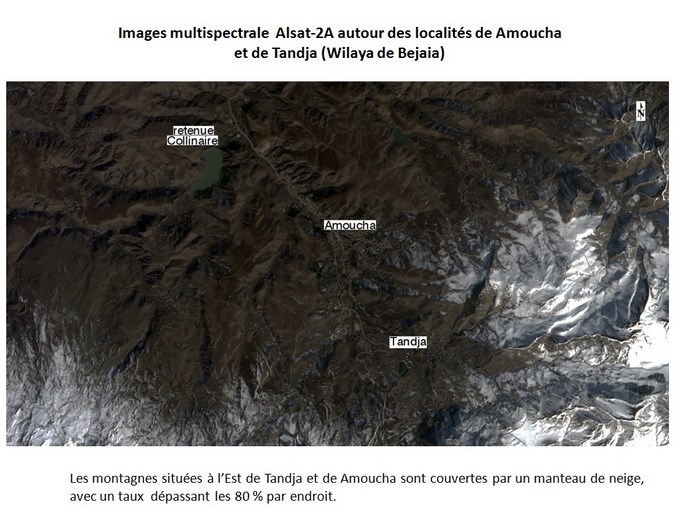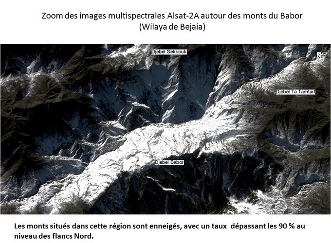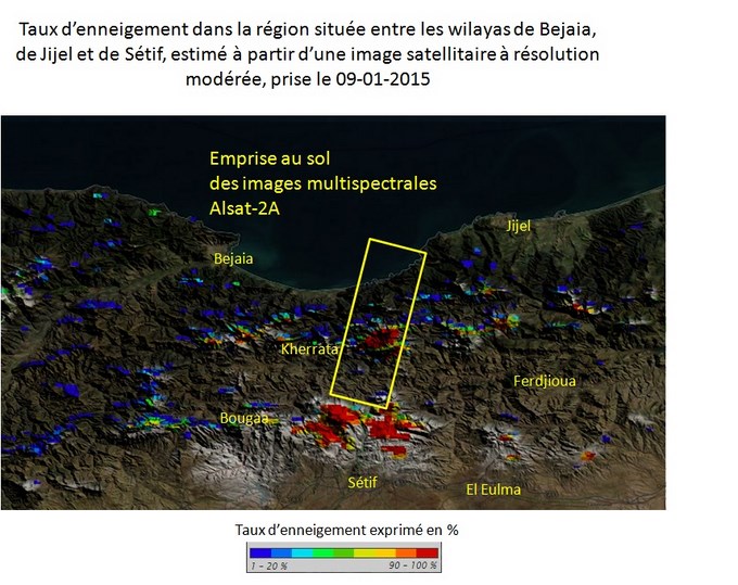 Les images multispectrales du satellite Alsat-2A , prises le 09 janvier 2015, couvrent principalement la région des monts du Babor, avec du Nord au Sud les localités et zones suivantes: 1- Ziama Mansouriah (Wilaya de Jijel), avec son port; 2- La région du barrage d’Erraguene et les djebels avoisinants; 3- Les monts du Babor, dont le sommet le plus haut culmine à plus de 2000 m, et abritent des forêts de cèdre de l’Atlas et de sapin de Numidie ; 4- Les localités de Amoucha et de Tandja (Wilaya de Bejaia). L’analyse des images multispectrales Alsat-2A, prises après les chutes de neige dans la région Est du pays, au cours de la période comprise entre la fin du mois de décembre 2014 et le début du mois de Janvier 2015, fait ressortir les éléments d’informations suivants: 1- Les sommets des montagnes de cette région sont enneigés; 2- Les régions proches du littoral, sont marquées par un taux d’enneigement ne dépassant pas les 20 %; 3- L’enneigement est très dense sur l’ensemble des Djebels appartenant au Babor; 4- Le fort taux d’enneigement, supérieur à 90%, concerne particulièrement les flancs Nord du Djebel Babor.