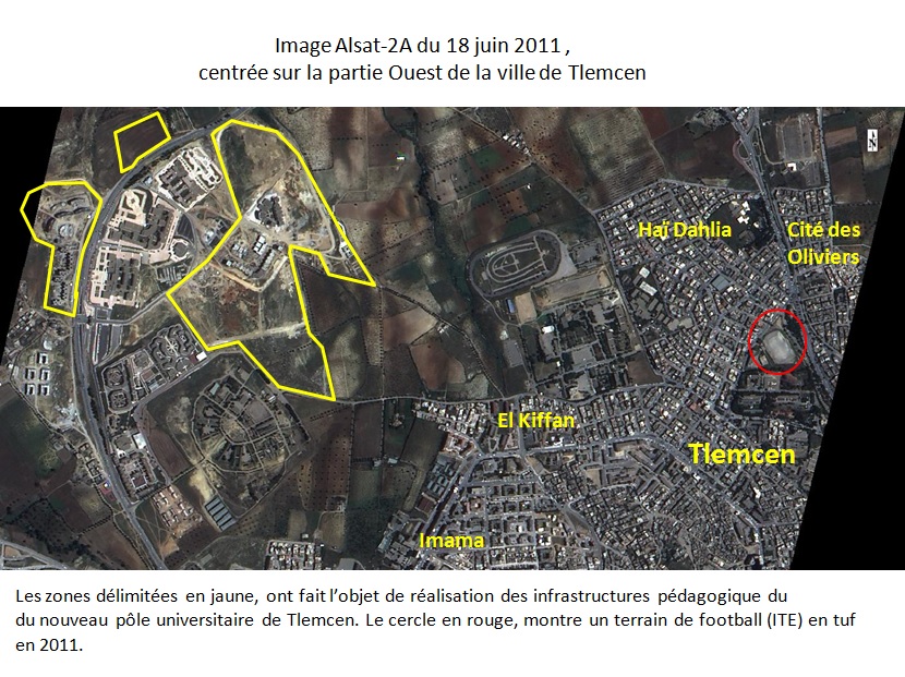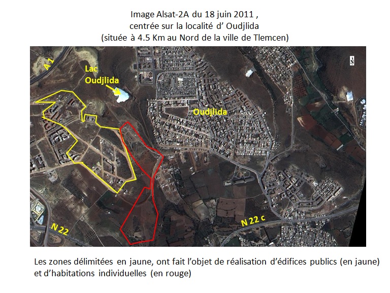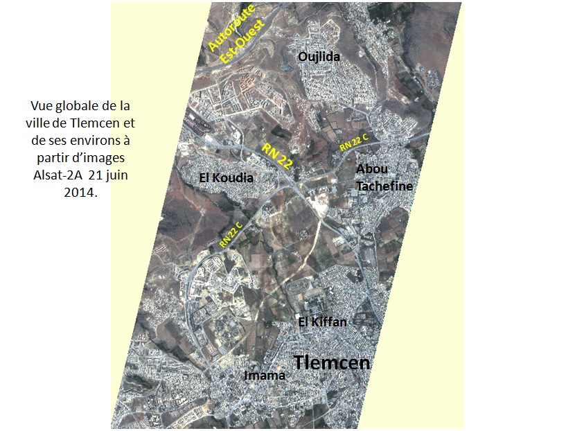 L’analyse diachronique (à deux dates) basée sur l’interprétation des images des satellites d’observation de la terre, constitue un moyen efficace de cartographie et de suivi des changements dans les milieux urbains. A ce titre, l’analyse comparative effectuée à partir des images Alsat-2A prises le 18 juin 2011 et le 21 juin 2014, soit à trois années d’intervalle, sur la ville de Tlemcen et des localités avoisinantes, indique des changements importants, notamment :