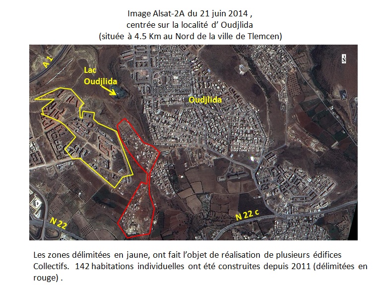 Les changements identifiés dans la partie Ouest de la ville, correspondent en général à la réalisation d’infrastructures universitaires, au niveau du nouveau pôle de Tlemcen, ainsi qu’au démarrage des travaux de terrassement d’un nouvel axe routier, reliant la RN 22 (entrée de Tlemcen) à ce nouveau pôle universitaire (RN 22C). Quant aux changements détectés dans l’agglomération d’Oudjlida, il s’agit en général de réalisation d’habitations collectives et/ou individuelles.