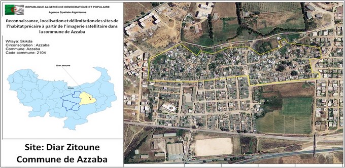 – Suivi de l’évolution de l’habitat précaire : cette étude a été réalisée au profit de la Wilaya de Skikda, qui visait une reconnaissance des sites d’habitat précaire par l’analyse et l’interprétation des images satellitaires à haute résolution, et l’élaboration d’une base de données géographiques pour la gestion et le suivi de l’habitat précaire. Dans ce cadre une application SIG a été développée, permettant le suivi de l’habitat précaire dans les communes d’Azzaba, El Ghedir, Ramdane Djamel, Beni Bechir, Salah Bouchaour.