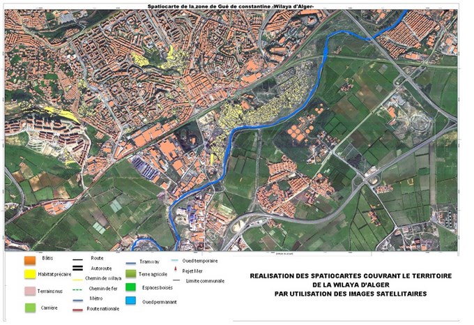 – Mise à jour de la cartographie de la wilaya d’Alger : réalisé au profit de la Direction de l’Aménagement du Territoire, de l’Urbanisme, de la Prévention et de la Résorption de l’Habitat Précaire, ce projet visait la réalisation de spatiocartes numériques à l’échelle du 1/5000ème sur l’ensemble du territoire de la Wilaya d’Alger. Ces spatiocartes ont permis la mise à jour des fonds cartographiques pour l’étude d’aménagement de la Baie d’Alger et la révision du Plan Directeur d’Aménagement et d’Urbanisme (PDAU) de la Wilaya.