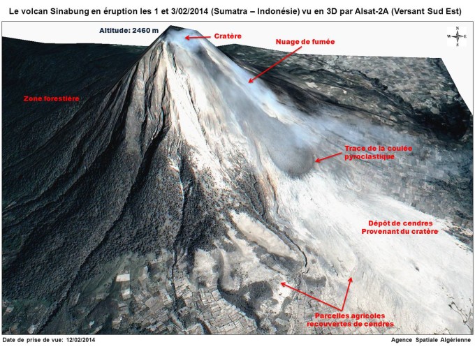 Le Sinabung, situé sur l’ile de Sumatra au Nord-Ouest de l’Indonésie, à une altitude de 2460 mètres, est entré en activité les 1 et 3 février 2014 en envoyant des roches et des cendres chaudes jusqu’à 2 000 mètres d’altitude.
