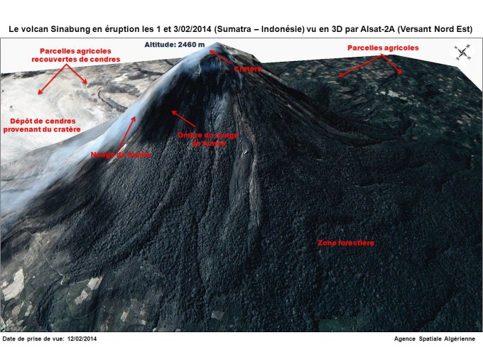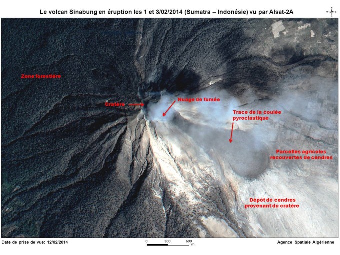 11 jours après l’éruption du volcan Sinabung, l’image Alsat-2A montre le nuage de fumée dégagé par le cratère, la trace de la coulée pyroclastique sur le flanc Sud Est, ainsi que les cendres blanchâtres qui ont recouvert les parcelles agricoles situées en aval, près du village de Sukameriah.