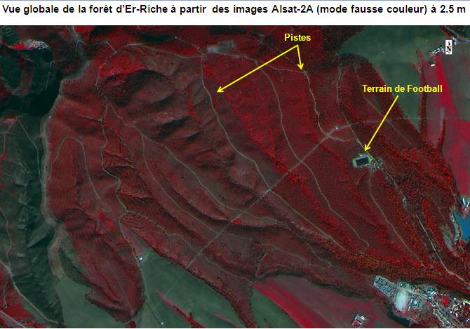 Par ailleurs, une clairière de la forêt d’Er-Riche située au Nord de la ville, a été concernée par la réalisation d’un stade de Football en gazon artificiel. L’identification du gazon artificiel a été rendue possible par l’analyse de l’image prise dans le canal proche-infrarouge.