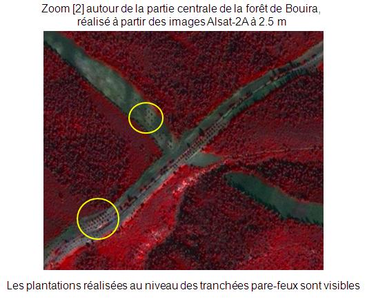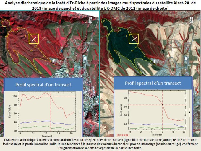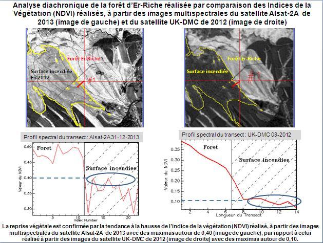 L’analyse écologique de cette forêt à partir des images Alsat-2A, s’appuyant sur une analyse comparative établie avec les images du satellite UK-DMC prises en 2012, montre une nette reprise végétale de la zone touchée par les feux.