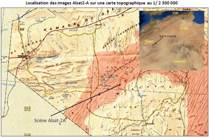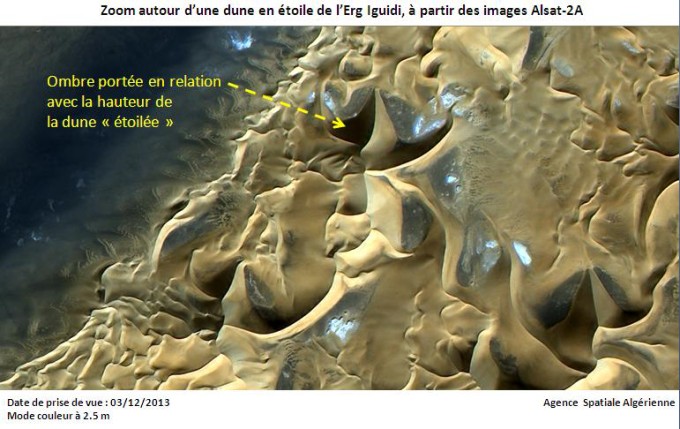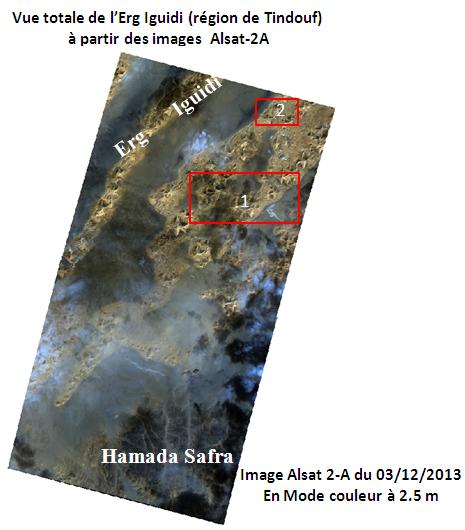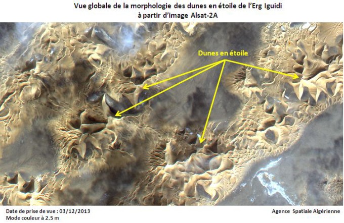 Situation géographique de l’Erg Iguidi L’Erg Iguidi est situé dans la plateforme Saharienne à plus de 300 Kms à l’Est de la ville de Tindouf, à 150 Kms au Nord de Chenachen. Il est entouré par les plateaux rocheux, Hamada Safra au Sud et Hamada Tounassine au Nord. Cette zone désertique subi une forte érosion provenant essentiellement du vent et des variations de température (thermoclastie). Analyse Géomorphologie des dunes à partir des images Alsat-2A L’Erg Iguidi est composé de dunes en étoiles, de forme pyramidale et appelées « Ghourds ». Ces dernières se forment dans les régions connaissant des vents multidirectionnels. Ces dunes qui sont sculptées en étoile par les vents, grandissent plus vers le haut que latéralement. Elles peuvent atteindre des centaines de mètres de haut. L’analyse des images Alsat-2A, prises le 03/12/2013 et couvrant la partie méridionale de l’Erg d’Iguidi, montre l’existence de cette forme en étoile des dunes, atteignant des hauteurs importantes. Ces hauteurs sont mises en évidence par l’importance de la surface occupée par les ombres portées des crêtes (Siouf) de ces dunes. Il est à noter, la présence de dunes « étoilées » à plus de 04 branches non symétriques, indiquant une légère dominance de l’une des directions fréquentes des vents qui affectent l’Erg. Enfin, il est à signaler la présence dans les espaces séparant ces édifices dunaires, de croûtes blanchâtres liées à la présence de formation à dominance gypseuse. |