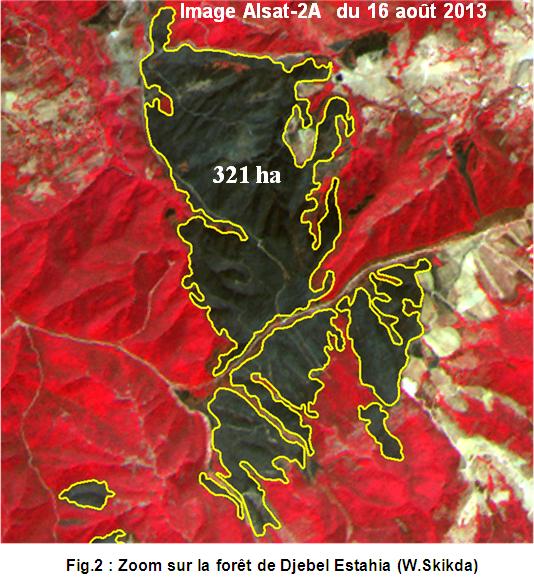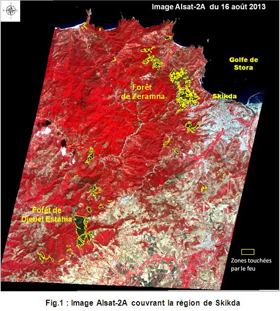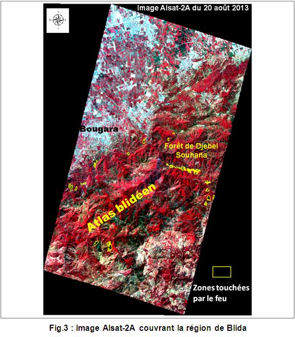 Dans le cadre de l’évaluation et du suivi des incendies de forêts durant l’été 2013, et en collaboration avec la Direction Générale des Forêts (DGF), l’ASAL a mobilisé les ressources du satellite Alsat-2A pour établir le bilan estival des feux de forêts. L’imagerie à haute résolution Alsat 2A complète l’utilisation des images satellitaires à moyenne résolution.