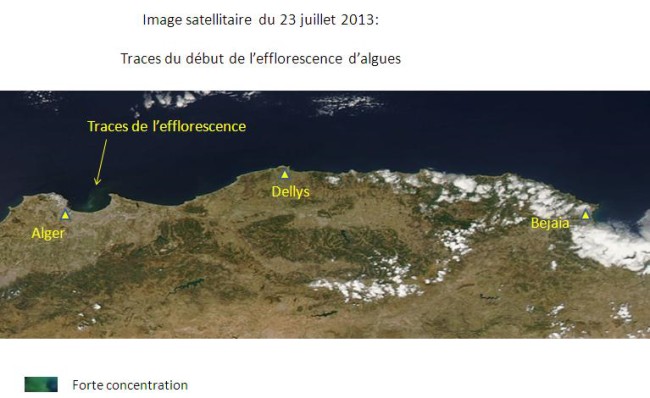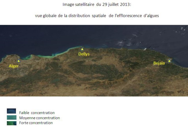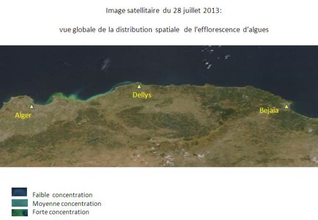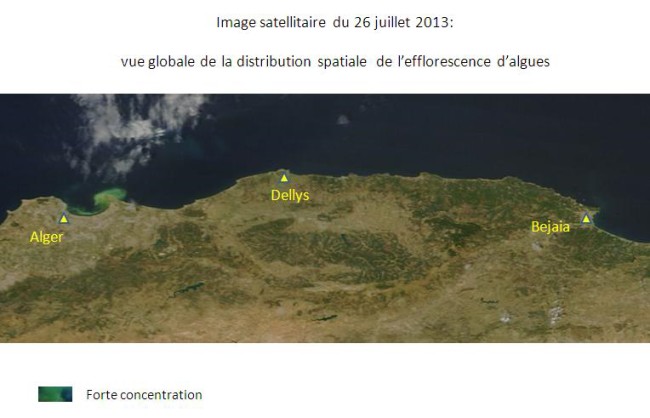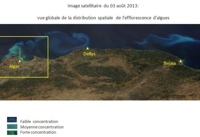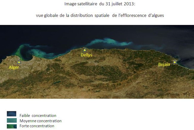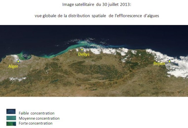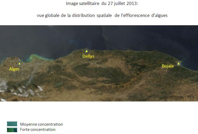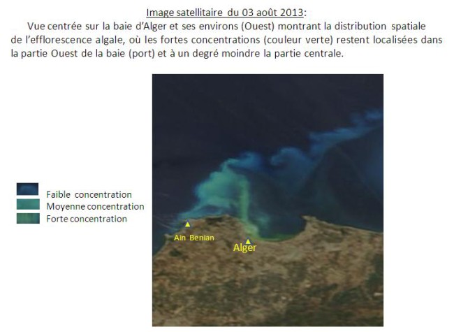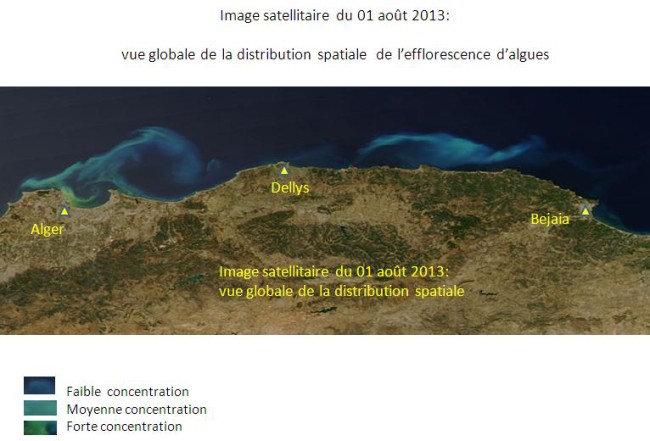 La baie d’Alger et ses environs sont touchés depuis le 23 juillet 2013 par une efflorescence algale, donnant ainsi une couleur verdâtre aux eaux de mer. Pour assurer un suivi quotidien de l’évolution de ce phénomène, l’ASAL exploite des images MODIS à faible résolution prises par deux satellites, appartenant à une mini-constellation dédiée au suivi environnemental. L’analyse spectrale de ces images satellitaires permet: 1- De catégoriser les eaux touchées par cette efflorescence, en trois classes de concentration en algues : forte, moyenne et faible concentration. Cette catégorisation est réalisée en fonction de l’analyse de la couleur des images satellitaires, prises dans la bande du visible et du proche infrarouge ; 2-D’assurer le suivi de la dispersion de cette efflorescence qui se déplace à la faveur des courants. Ainsi, l’Analyse des images satellitaires des 12 jours depuis le 23 juillet 2013, indique que: 1- Les eaux de la baie d’Alger demeurent très touchées par cette efflorescence algale, notamment sa partie Ouest (Le port) et à un degré moindre sa partie centrale (au large de Hussein-dey). 2- Les rivages situés à l’ouest de la baie d’Alger, jusqu’à Ain Benian, sont les plus exposés, depuis le 30 juillet 2013 à ce jour. 3- Les parties Est de la baie d’Alger (Bordj-El Kiffan, Bordj El Bahri), ont été particulièrement touchées pendant 04 jours, du 25 et 29 juillet 2013. 4- Les traces de cette efflorescence de forte concentration ont été observées au large de Dellys dès le 28 juillet 2013, et ont entamé leur dispersion (moyenne et faible concentration) depuis le 30 juillet 2013. 5- Des traces de faible et même très faible concentration ont été observées au large des villes d’Azzefoune et de Bejaia depuis le 1er aout 2013. |