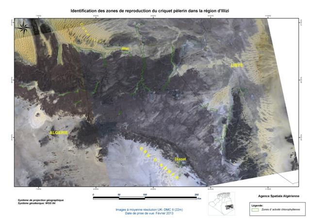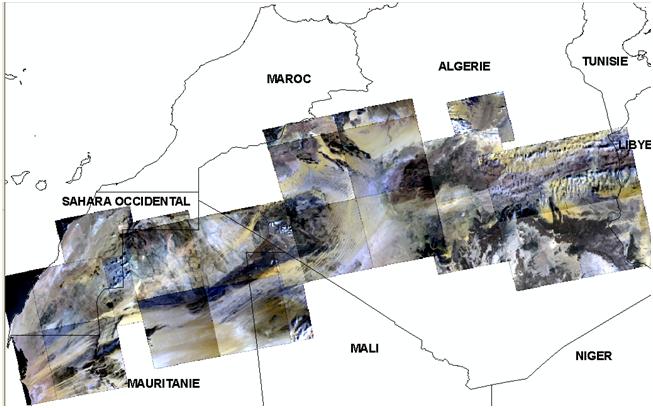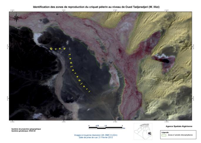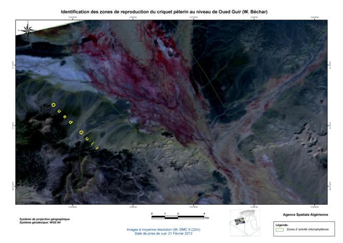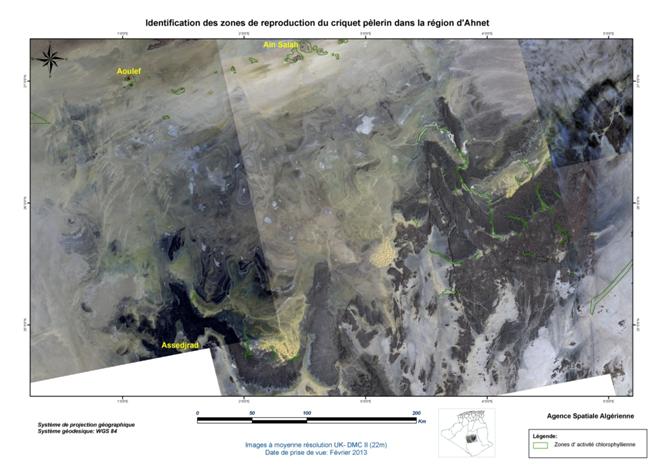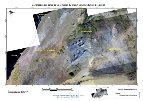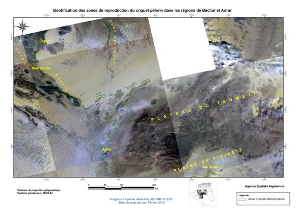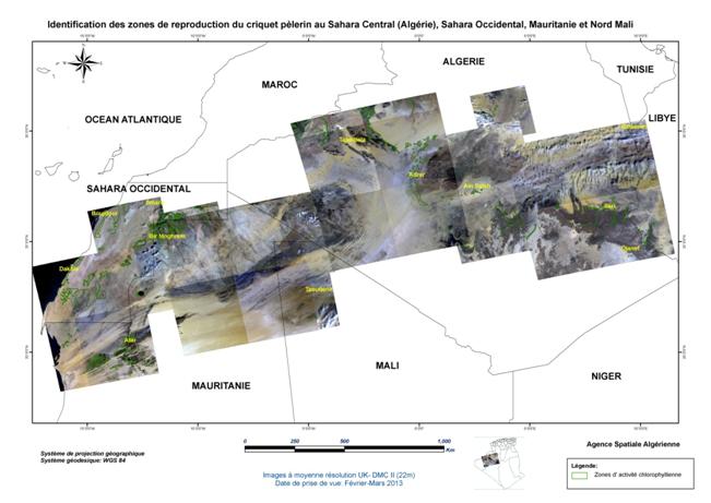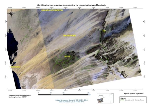 Dans le cadre de sa collaboration avec le Ministère de l’Agriculture et du Développement Rural (MADR), et à la demande de l’Institut National de Protection des Végétaux (INPV), l’Agence Spatiale Algérienne (ASAL) a mené la campagne printanière de lutte contre le criquet pèlerin et poursuivi sa mission de localisation des zones écologiquement favorables, susceptibles d’abriter la reproduction acridienne en cette période. A ce titre, elle a exploité les images satellitaires à moyenne résolution, des mois de février et mars 2013, couvrant les régions du Sud Algérien (Wilayas de Béchar, Tindouf, Adrar, Tamanrasset et Illizi), le Sahara Occidental, la Mauritanie et le Nord Mali, sur une superficie de 2 334 906 km2 Figure 1 : Carte de situation de la région d’intérêt concernée par l’analyse des conditions écologiques du criquet pèlerin à partir des images satellitaires UK DMC II, de février et mars 2013. L’analyse des conditions écologiques à partir des images satellitaires à moyenne résolution, a permis de localiser les zones potentielles pouvant abriter le criquet pèlerin, notamment dans les régions de Béchar et d’Illizi (Algérie), au Sahara Occidental et en Mauritanie. En Algérie, le couvert végétal, généralement localisé au niveau des lits d’oueds, est de moyenne densité et présente une activité chlorophyllienne moyenne à importante dans les régions d’Adrar et Illizi. Au niveau de l’oued Guir dans la wilaya de Béchar, cette activité est très forte. Au Sahara Occidental, le couvert végétal présente une très forte activité chlorophyllienne au niveau de la région de Smara, à la frontière mauritanienne. Au niveau de la côte, la végétation est éparse mais présente une forte activité chlorophyllienne. Les zones identifiées dans la région étudiée se caractérisent par des conditions écologiques très favorables à la reproduction du criquet pèlerin. Figure 2 : Identification des zones de reproduction du criquet pèlerin au Sahara Central (Algérie), Sahara Occidental, Mauritanie et Nord Mali. Figure 3 : Identification des zones de reproduction du criquet pèlerin en Mauritanie.