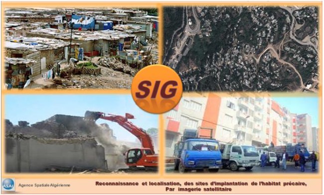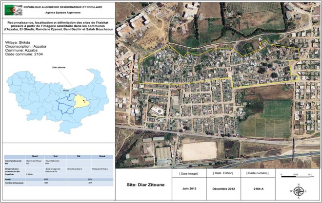 Dans le cadre de l’utilisation des technologies spatiales au bénéfice du développement local, une étude a été réalisée dans la Wilaya de Skikda à partir de l’imagerie satellitaire. Cette étude s’appuie sur le développement d’une application SIG (Système d’Information Géographique), permettant le suivi de l’évolution de l’habitat précaire dans les communes de Azzaba, El Ghedir, Ramdane Djamel, Beni Bechir, Salah Bouchaour. L’outil développé permet la localisation et la délimitation des sites d’habitat précaire en utilisant l’imagerie satellitaire. L’extraction des informations thématiques issues d’images satellitaires acquises en 2012, ont été comparées au recensement de ces sites, élaboré en 2007 par les services de la Direction de l’Urbanisme, de la Construction et de l’Habitat de la Wilaya de Skikda (DUCH). Le SIG développé permet l’aide à la décision, pour une meilleure gestion des problèmes liés à l’urbanisme et à la planification régionale. L’étude est structurée en deux parties: – La première partie aborde le contexte, la reconnaissance des sites d’habitat précaire, l’analyse et l’interprétation du résultat. – La deuxième partie, quant à elle, présente les étapes d’élaboration d’une base de données géographiques, pour la gestion et le suivi de l’évolution de l’habitat précaire. |
