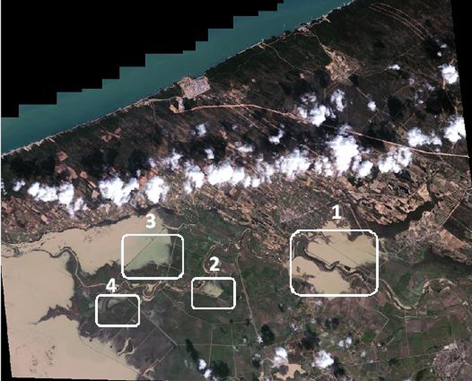 Comme le montre la figure 2, 10 communes sur les 24 que comptent la Wilaya d’El-Tarf ont été touchées par le sinistre. Un travail de précision à partir de l’imagerie satellitaire à très haute résolution, a été effectué sur des zones représentatives pour suivre le phénomène de résorption des eaux (voir Fig 3 et 4). |
