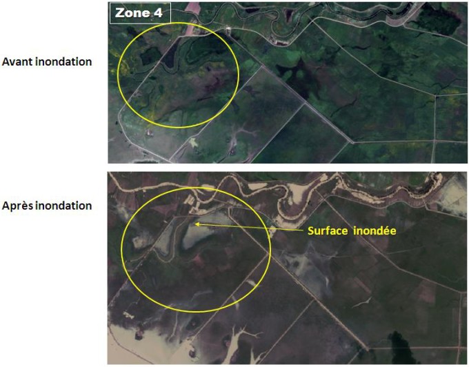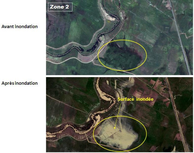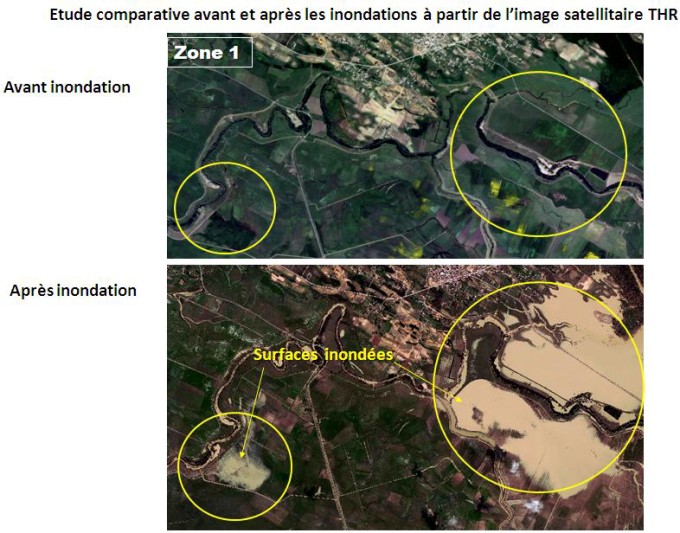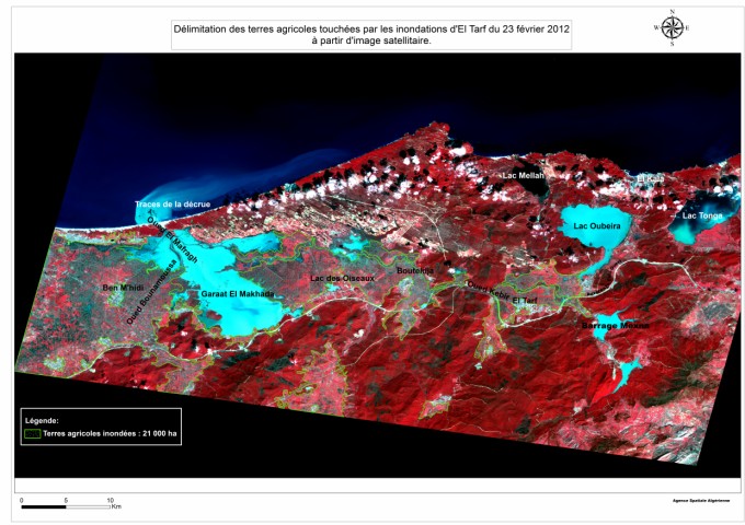 Au lendemain des inondations qui ont affecté la région d’El Tarf le 23 février 2012, l’Agence Spatiale Algérienne a entrepris, en collaboration avec la Direction Générale de la Protection Civile et les ministères, de l’Agriculture et du Développement Rural et des Ressources en Eau, au déclenchement de la Charte internationale « espace et risques majeurs », afin de disposer de données satellitaires complémentaires aux images Alsat 2A. L’étude comparative avant et après le sinistre, réalisée par l’ASAL à partir du traitement des images satellitaires a permis de réaliser une carte de délimitation précise des terres agricoles inondées avec leurs superficies, ainsi que les agglomérations touchées (voir Fig 1 et 2).