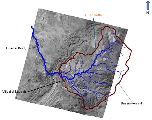 Figure 1 : Superposition du réseau hydrographique hiérarchisé du bassin versant de l’oued Defaa sur une orthoimage Alsat-2A prise sur El Bayadh et ses environs.