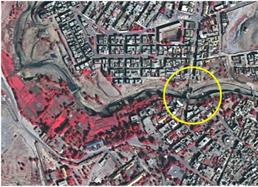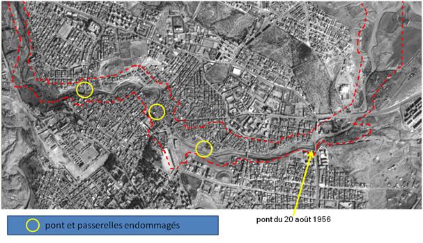 Aussi, l’analyse des images satellites a montré que les eaux de la crue de l’Oued Defaa du 1er octobre 2011, chargées d’apport solide et de débris charriés par cet Oued, ont débordé sur la rive droite à l’entrée de la ville (en amont : entrée Est de la ville), à quelques centaines de mètres à l’Est du pont du 20 août 1956, reliant El Bayadh à l’aéroport [figure 6].