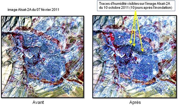 L’exploitation des images satellitaires prises avant et après les inondations, a permis la délimitation de la zone inondée par la détection de l’humidité des sols, qui a été mise en évidence à travers les analyses multispectrales effectuées sur les images du satellite Alsat-2A [figure 2 et 3], Kompsat [figure 4 & 5] et Worldview-2 [figure 6].