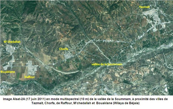 Image Alsat-2A (17 juin 2011) en noir et blanc ( mode panchromatique) à 2.5 m autour de la ville de Tazmalt (Wilaya de Béjaia)