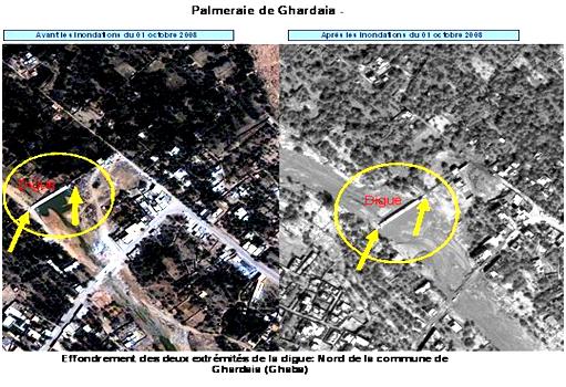 La gestion et le suivi des catastrophes naturelles représentent une des priorités du Programme Spatial National horizon 2020, dans son volet applicatif. Dans ce cadre à la suite des inondations du 1er octobre 2008, ayant touchés 9 communes de la wilaya de Ghardaïa, l’ASAL en étroite collaboration avec le Ministère de l’Habitat et de l’Urbanisme, le Ministère de l’Agriculture et du Développement Rural, les services de wilaya et l’Office de la Promotion de la Vallée du M’Zab, a mené un travail minutieux, d’analyse et d’évaluation des dommages occasionnés par le dégât des eaux, à même de restituer aux décideurs les informations clés, nécessaires aux mesures d’urgence à entreprendre.
