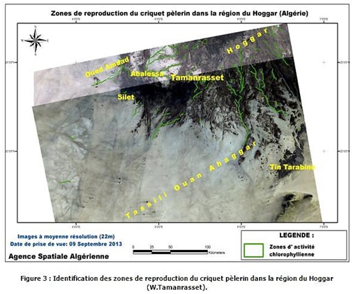 Ces images satellitaires ont permis d’évaluer l’activité chlorophyllienne existante dans ces régions. L’analyse des conditions écologiques a permis de localiser les zones susceptibles d’abriter le criquet pèlerin sur une superficie de 481 210 km2.